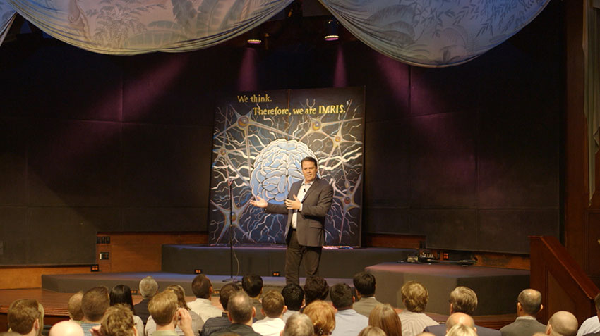The evening began in a theater with a single violinist playing a striking melody, joined by a guitarist and a chalk artist standing beneath his 10-foot tall creation. In vibrant blues and purples stood the illustration of a human brain and a bold, caption that read, “We think. Therefore, we are IMRIS.” As a pair of narrators took the stage, they told an animated story of how IMRIS was born from a single thought, which became a symphony of thoughts, involving minds of all kinds working together for a single purpose.