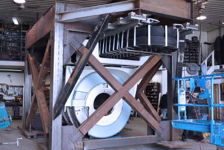 It consists of a stabilizer pad, a bolt-on accessory mounted directly under the magnet. During the operation, as the iMRI travels into the IMRIS Surgical Theatre, the pad is elevated about 25 mm above the ground. Then, when it’s time for imaging, the pad lowers to the floor. The hanging rails support the actual weight of the magnet, while the stabilizer prevents it from swinging side-to-side during seismic activity.